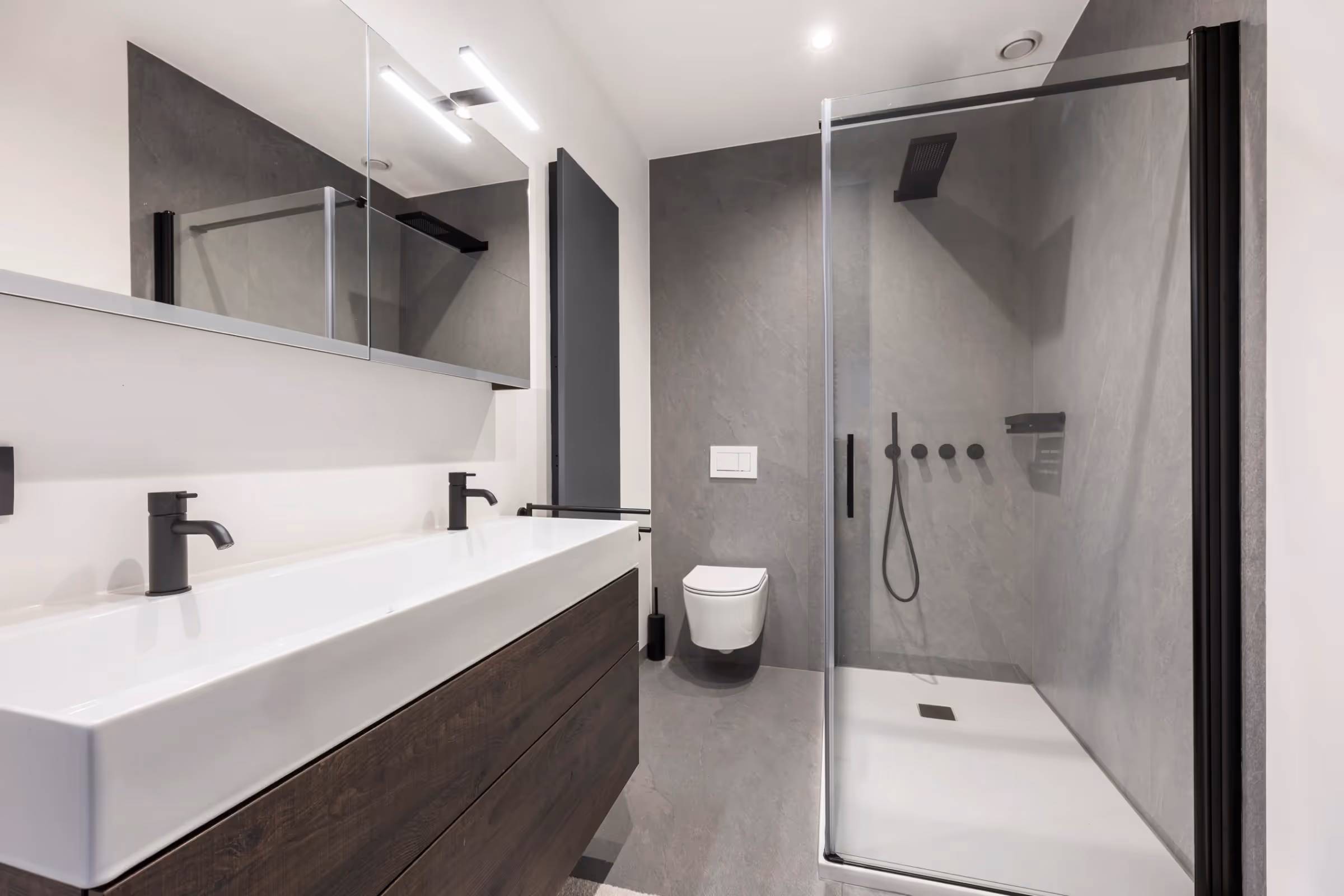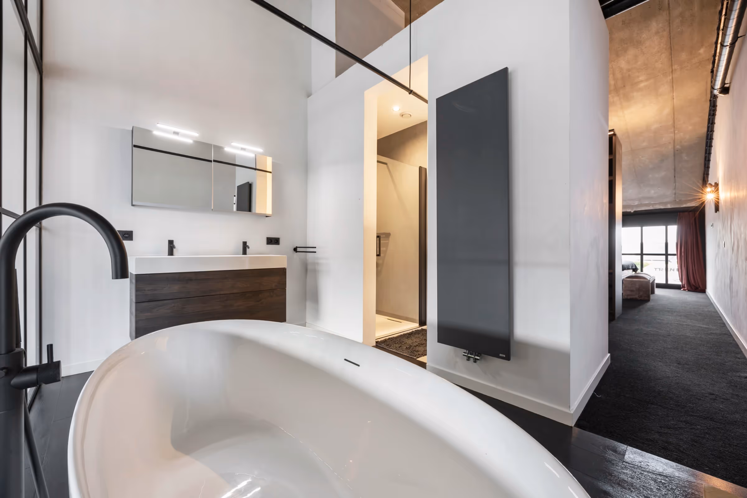 Via de zwarte, stalen trappartij bereik je de vide / overloop op de 1e verdieping. De badkamer is hier de eye-catcher, met een vrijstaand ligbad gelegen achter de stalen raampartij en met zicht op de woonkamer. Verder beschikt deze badkamer over een inloopdouche, een riant wastafelmeubel met dubbele wastafel en een extra toilet. Vervolgens liggen op deze verdieping nog 2 zeer ruim bemeten slaapkamers, waarvan de hoofdslaapkamer over een kastenwand beschikt. De andere slaapkamer op deze verdieping, beschikt ook over een eigen badkamer (de 3e in deze loft) en deze is voorzien van een wederom een mooi wastafelmeubel met dubbele wastafel, een toilet en een inloopdouche.
