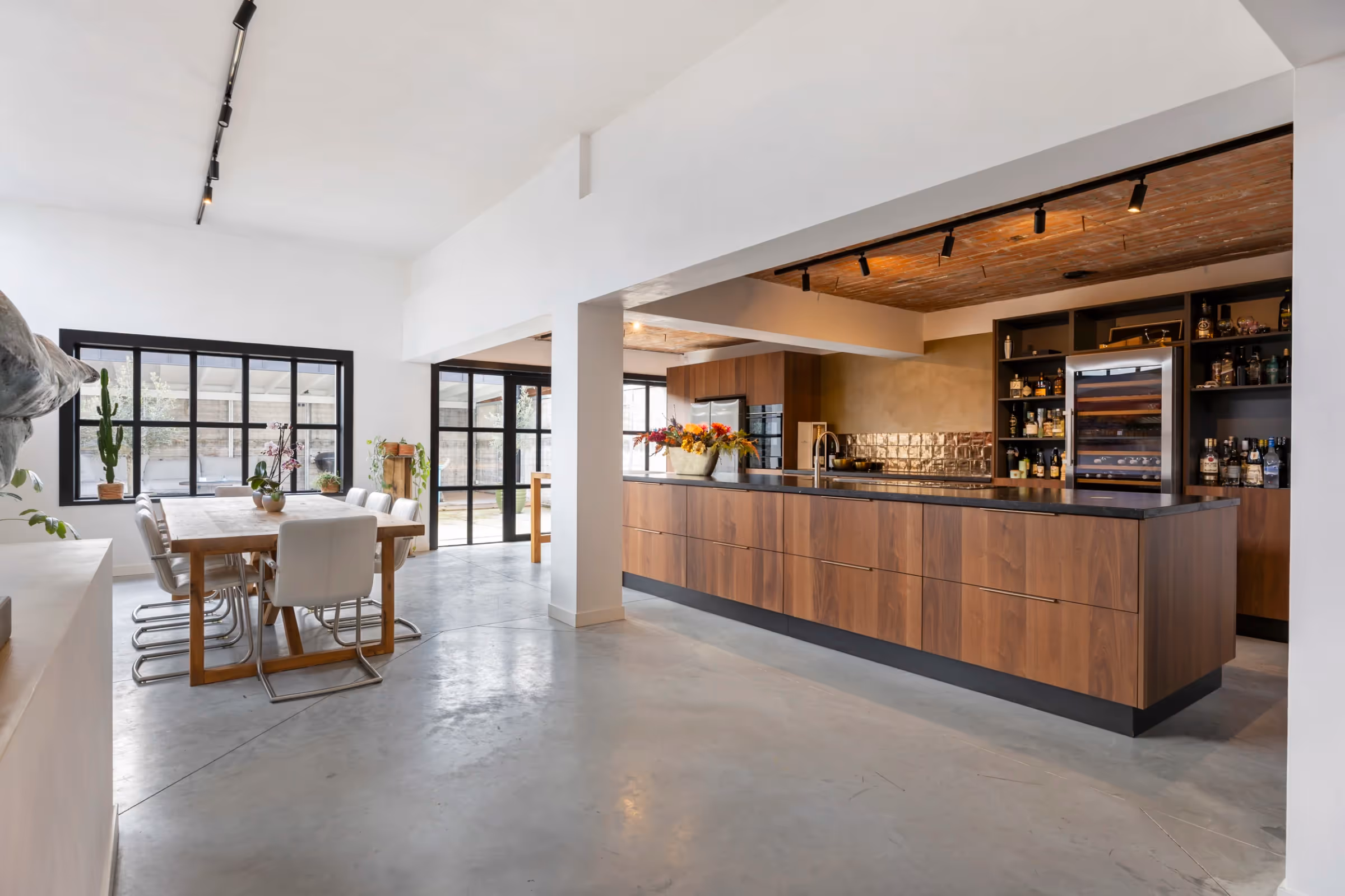 In open verbinding met de riante woonkamer, ligt de luxe leefkeuken met zeer royaal eiland. De warme, walnoot houten kasten en het bakstenen plafond erboven vormen ook weer een prachtige combinatie. De keuken beschikt over hoogwaardige kwaliteit apparatuur, namelijk: een Amerikaanse koelkast met vriezer, een grote wijnklimaatkast, een inductie kookplaat met afzuiging, een oven en een vaatwasser. Tenslotte is in deze riante woonkeuken plaats genoeg voor een royale eettafel, om heerlijk te genieten met vrienden en familie. Vanuit de keuken is de tuin te bereiken.