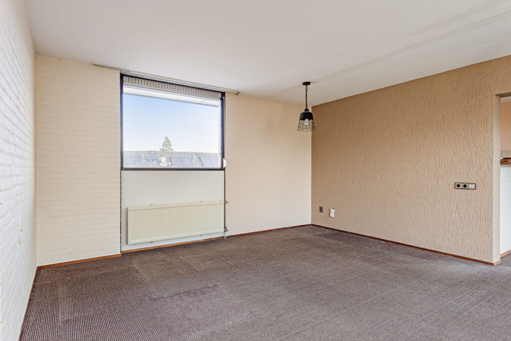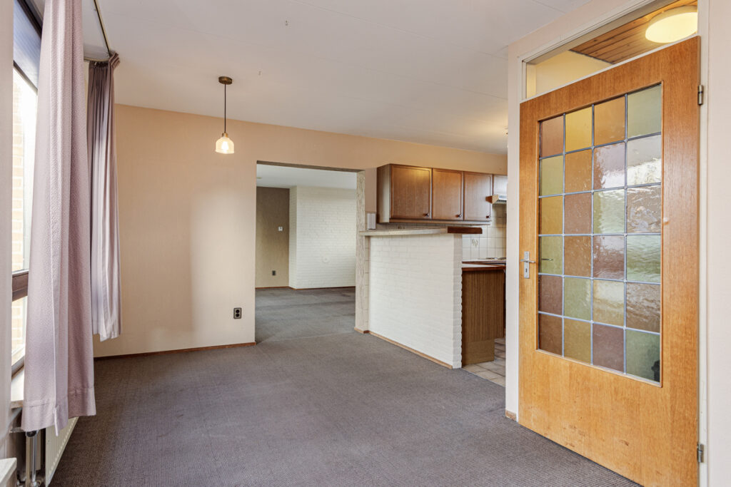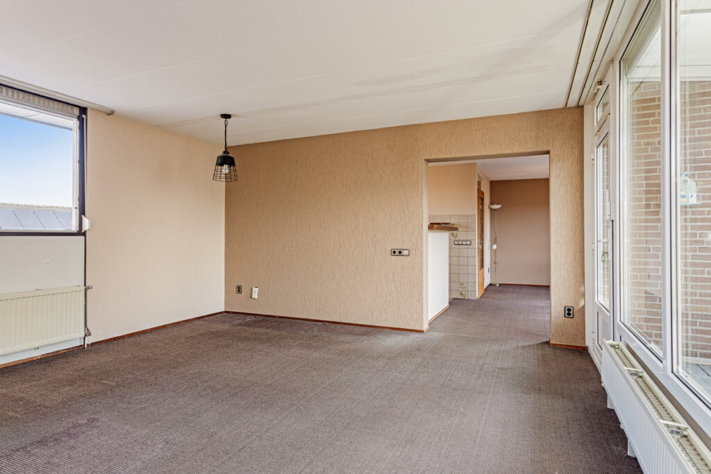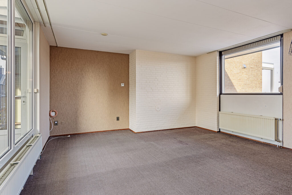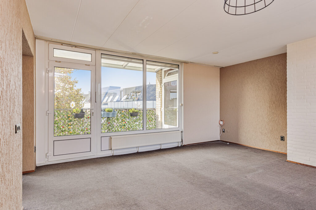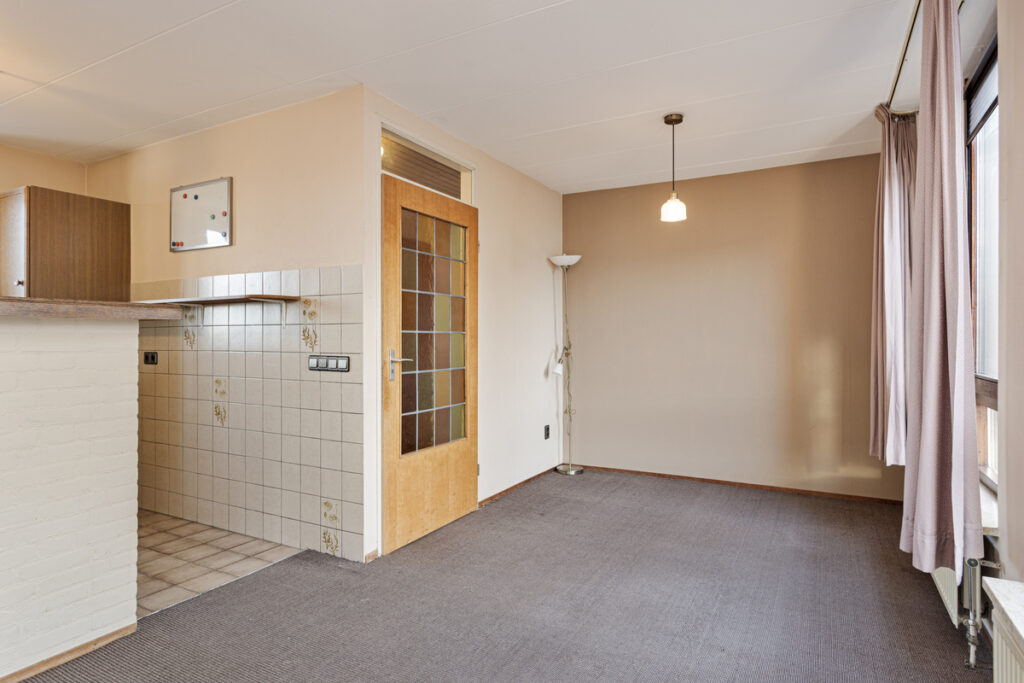 De woonkamer is verdeeld in een zit- en eetkamer en door het feit dat het appartement grote kozijnen heeft, heeft het lekker veel lichtinval.